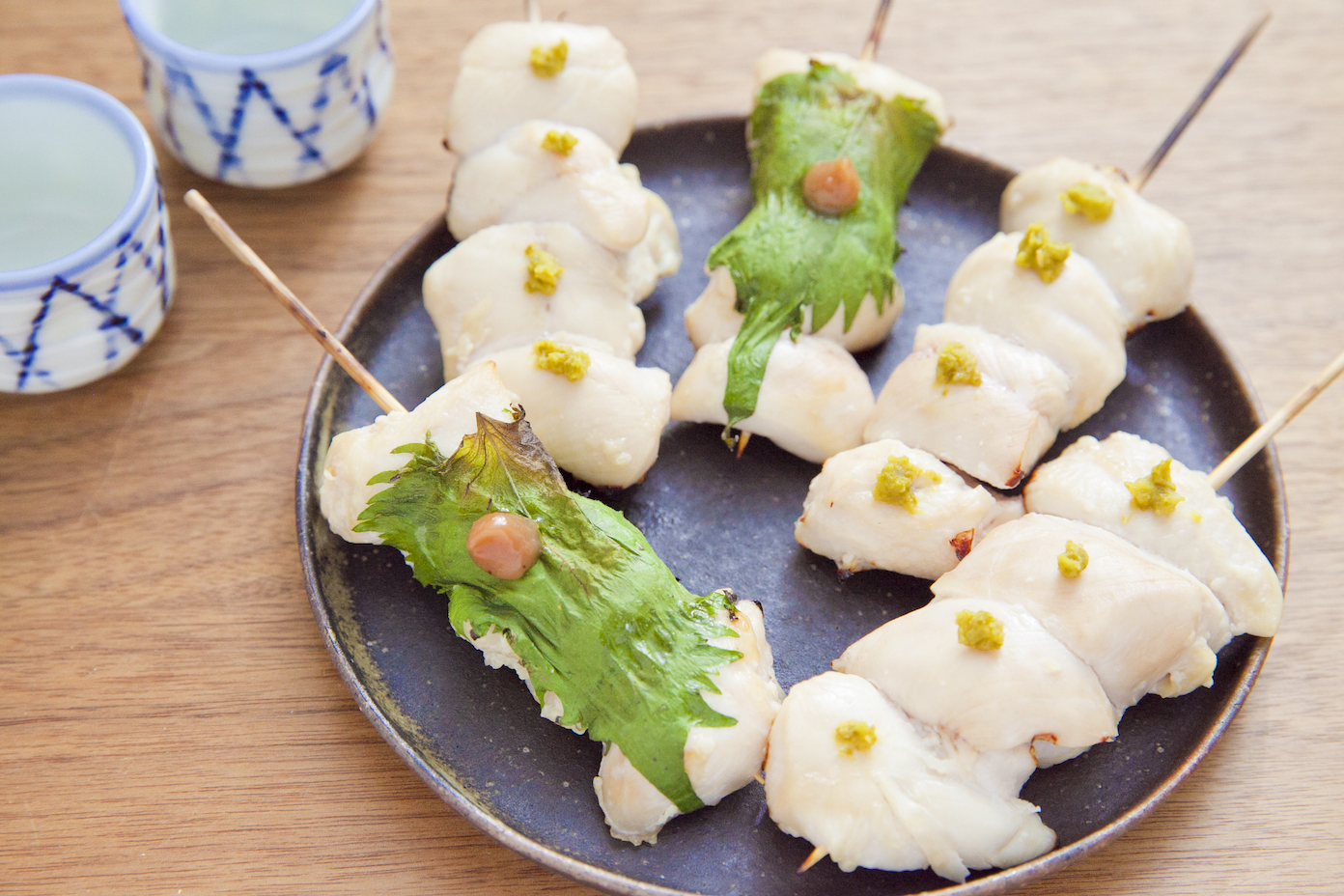 焼きあがったら、大葉を巻いたものには練り梅、巻いていないものには柚子胡椒をのせる。