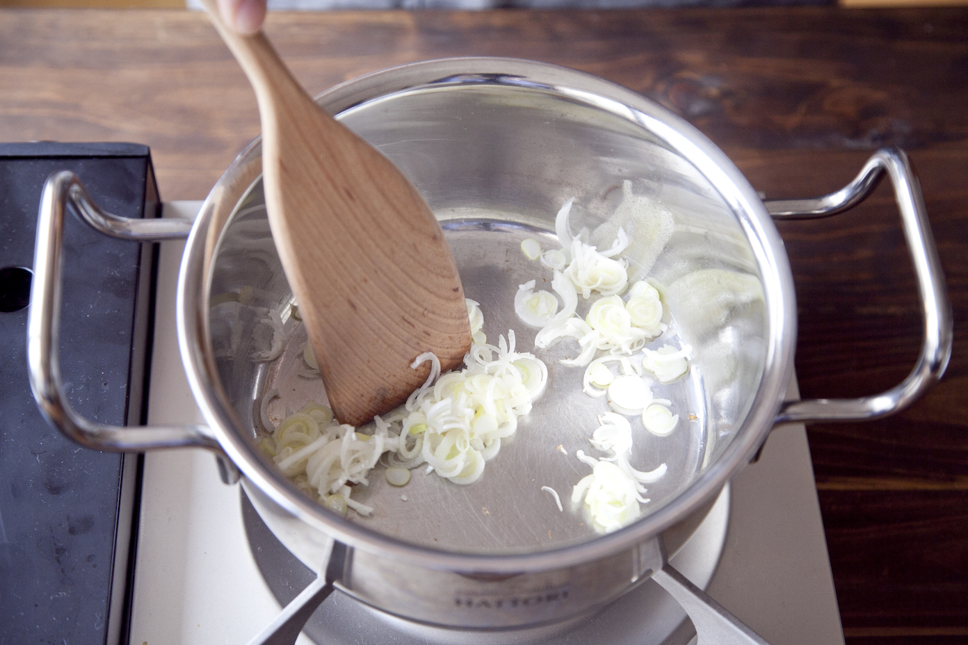 鍋にごま油を中火で熱し、長ねぎを入れてさっと炒める。