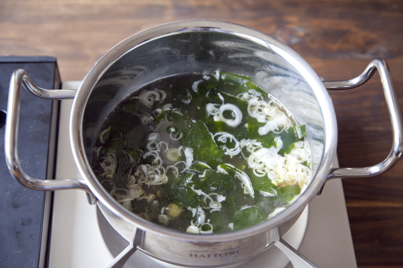 長ねぎに油が回ったら水2カップ、中華スープの素を加え、