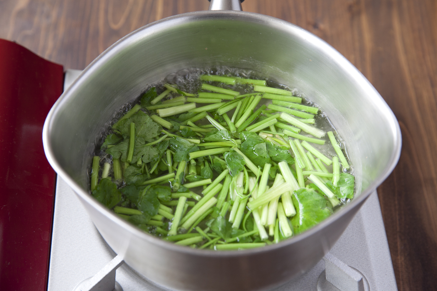 鍋にだし汁を注いで中火にかけ、沸騰したらせりを加える。