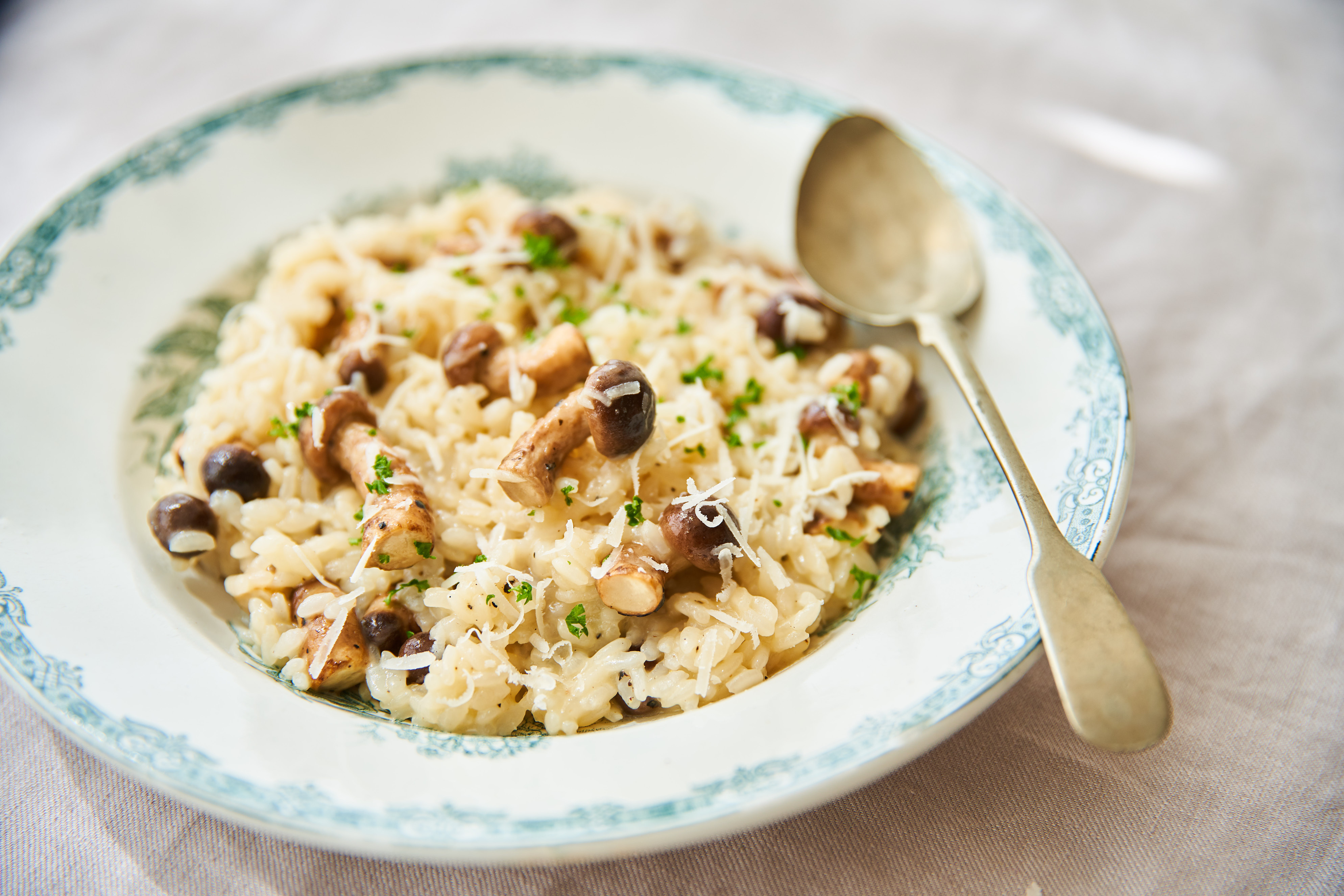食べてみて、ごはんに少し芯がのこるくらいになったら、3のしいたけ、(A)を加え混ぜ、塩こしょうで味をととのえて器に盛り付ける。好みでパルミジャーノレッジャーノ(分量外)を削りかけ、パセリを散らす。
