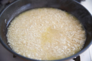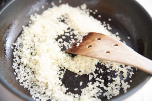 同じフライパンにオリーブオイル大さじ1を熱し、米を洗わずに加え中火で炒める。