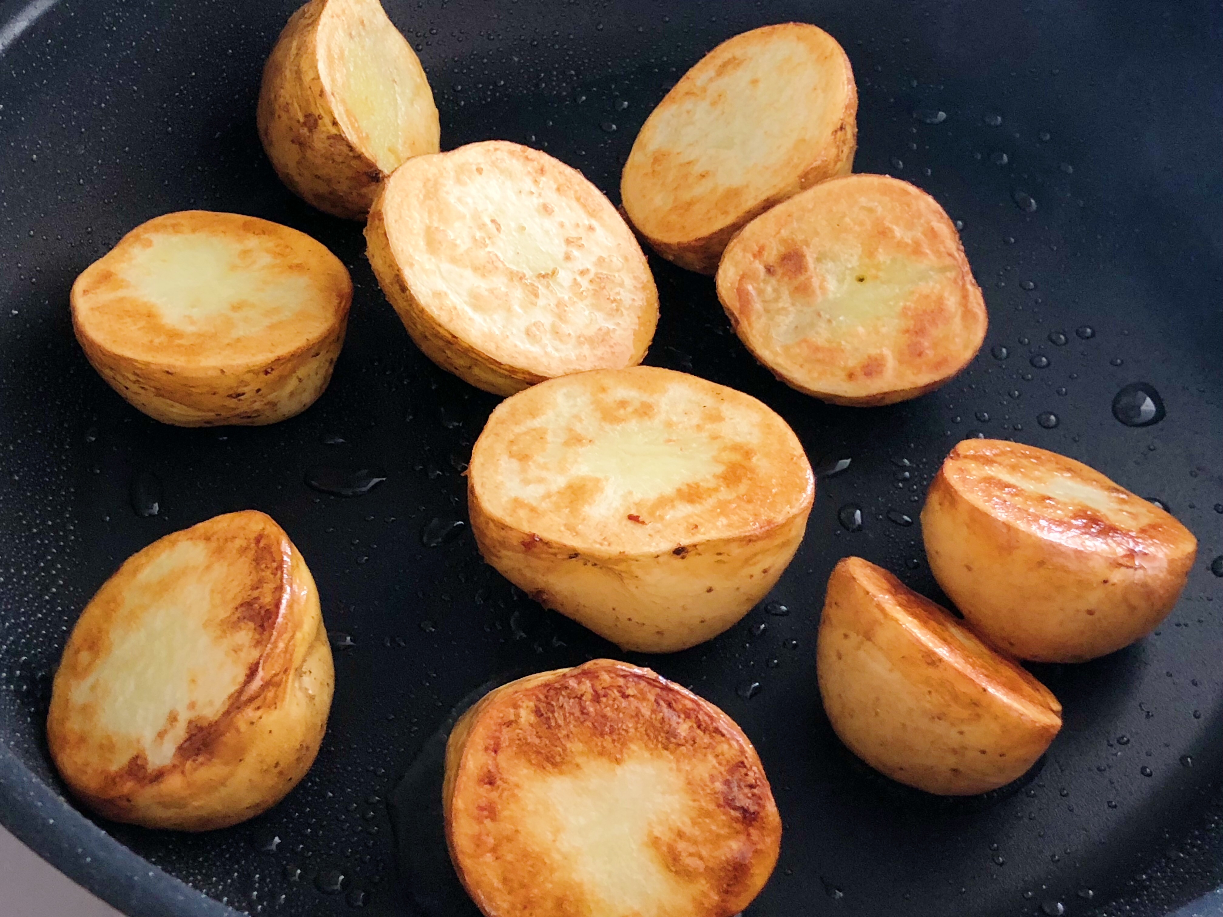 フライパンにオリーブオイルを熱し、1の新じゃがいもの切り口を下にして中火にかける。最初は触らずに切り口がいい焼き色になったら転がしながら全体に焼き色をつけて一度取り出す。