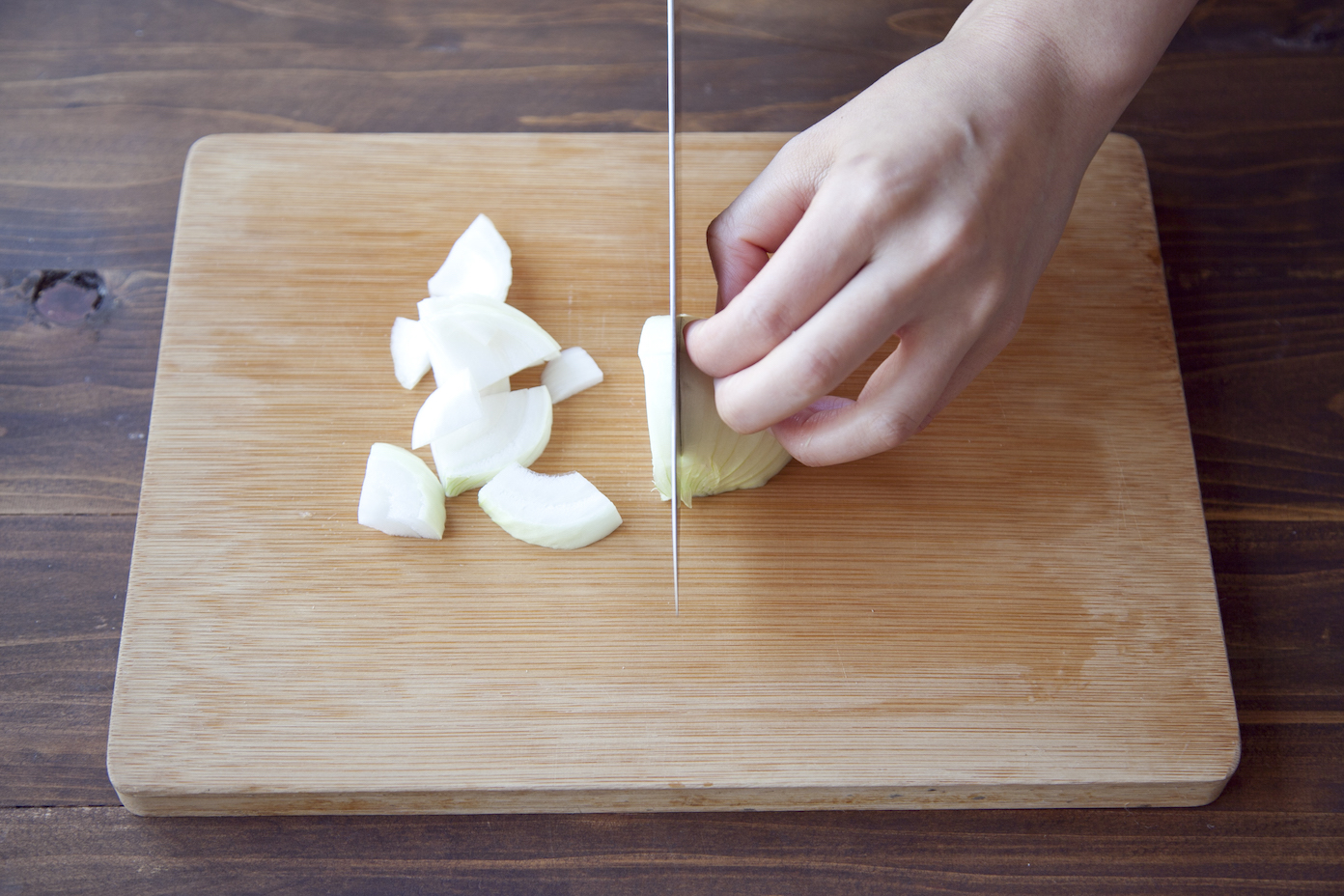 新玉ねぎは横半分に切ってから、繊維に沿って1cm幅に切る。