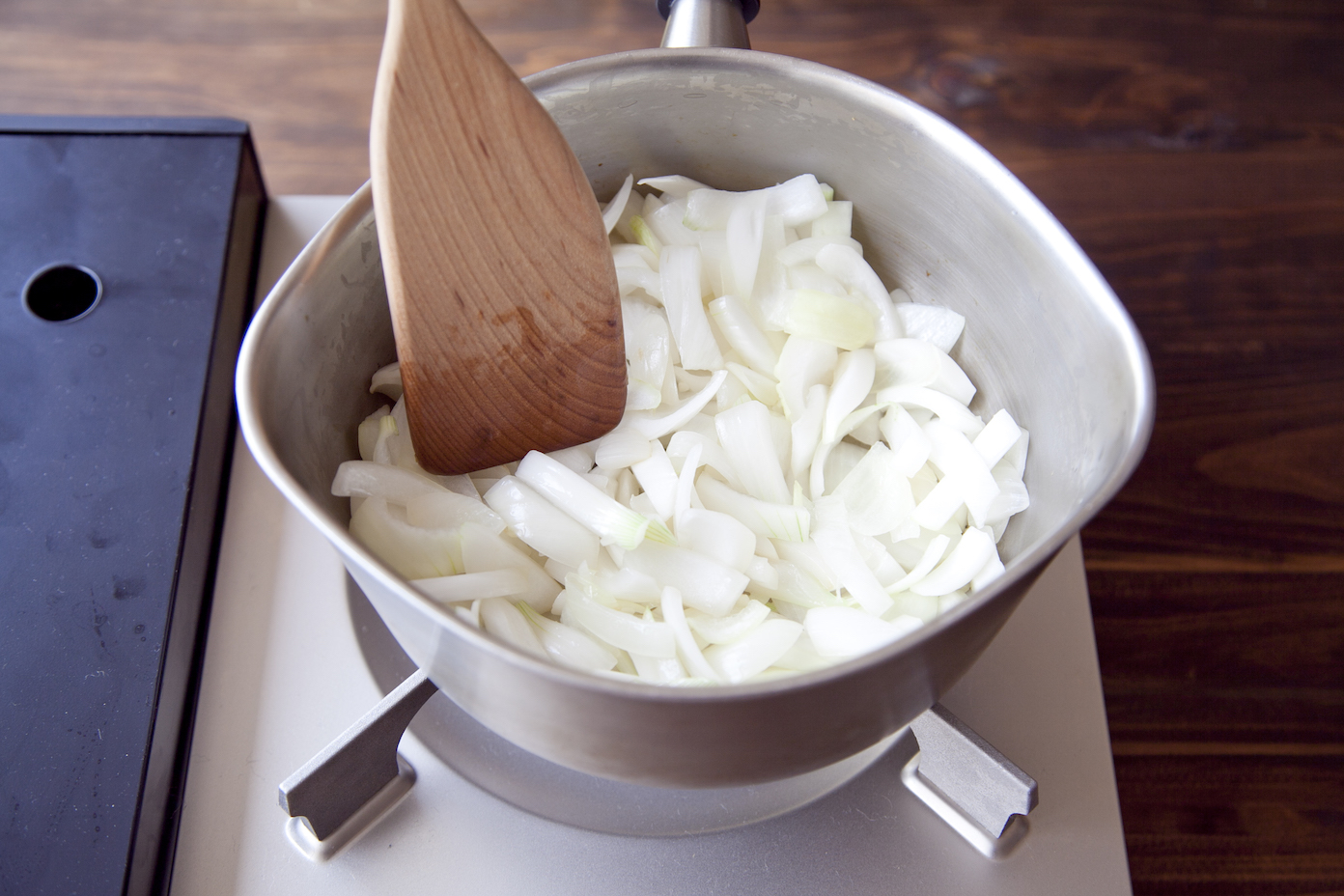 鍋にサラダを中火で熱し、新玉ねぎを炒める。