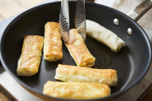 フライパンにオリーブオイルを中火で熱し、上下を返しながら3〜4分かけてカリッと揚げ焼きにする。