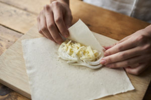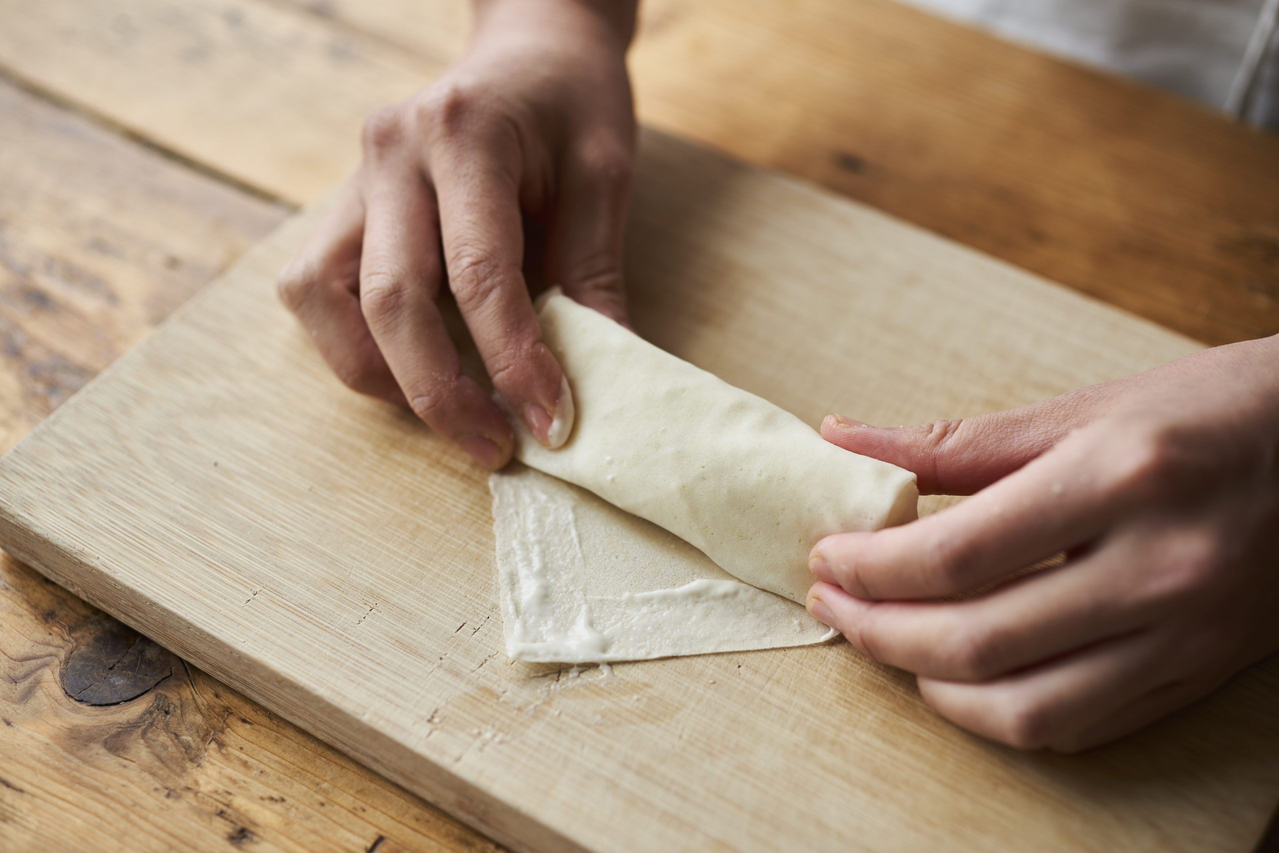 巻き終わりをのり(小麦粉適量を同量の水で溶いたもの)で止める。