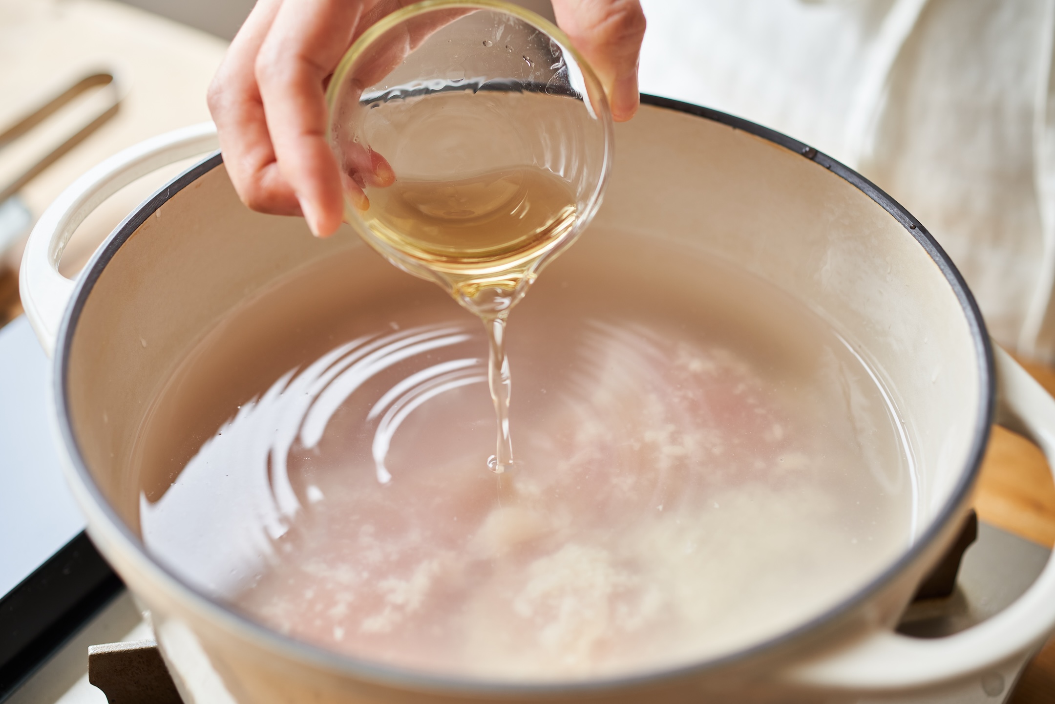 水を1リットル程度注ぎ、酒を加えて弱めの中火にかける。