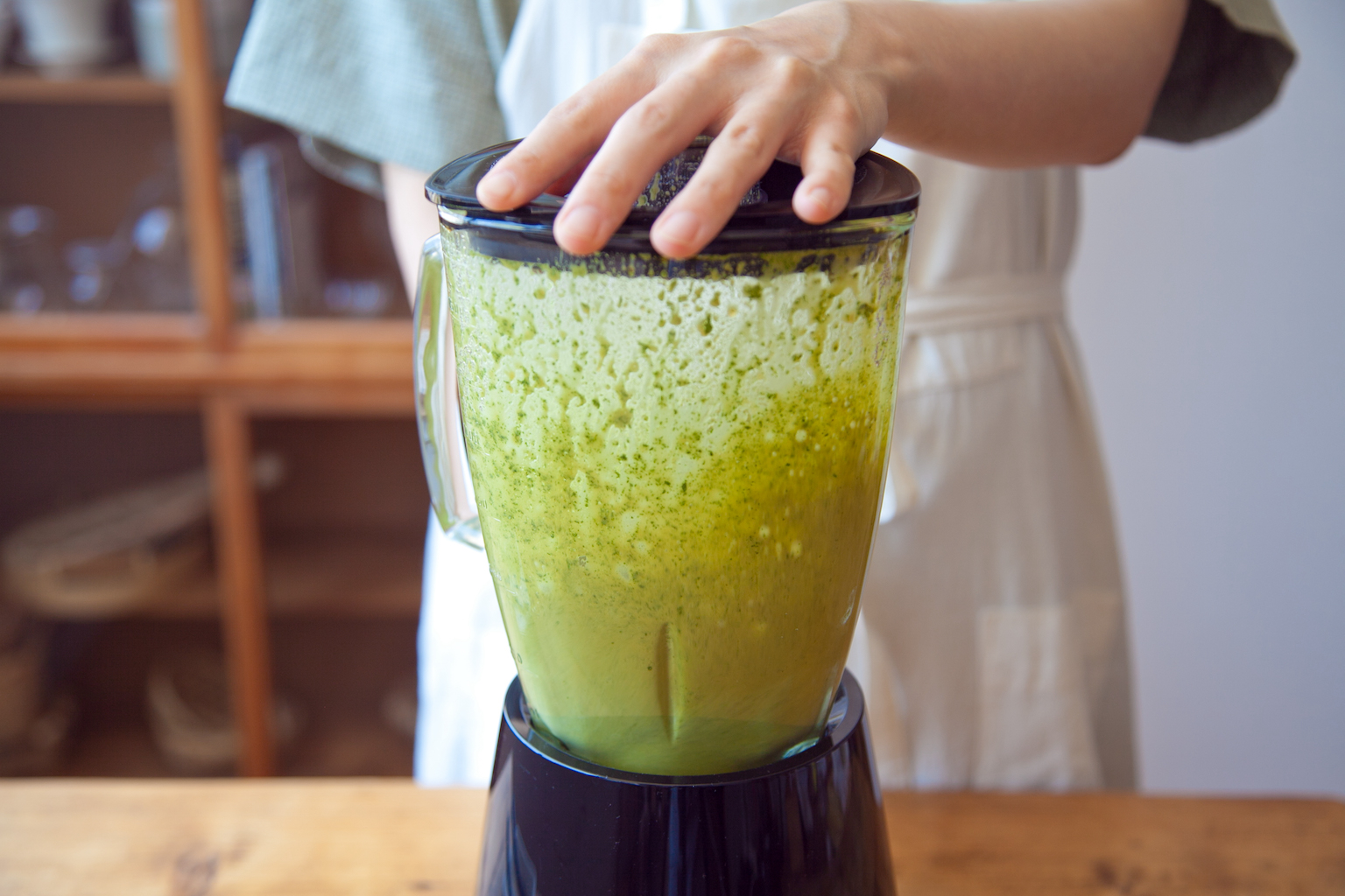 青じそは水気をしっかり拭き取り、ミキサーにちぎりいれる。