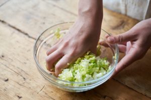 ボウルにキャベツを入れ、塩小さじ1/4(分量外)を揉みこんで5分おき、水気を絞る。