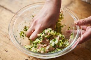 ボウルに(A)を入れて練り混ぜ、キャベツ、青じそを加え混ぜる。