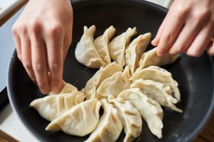 フライパンにサラダ油を中火で熱し、一度火を止めて餃子を並べ入れる。