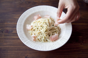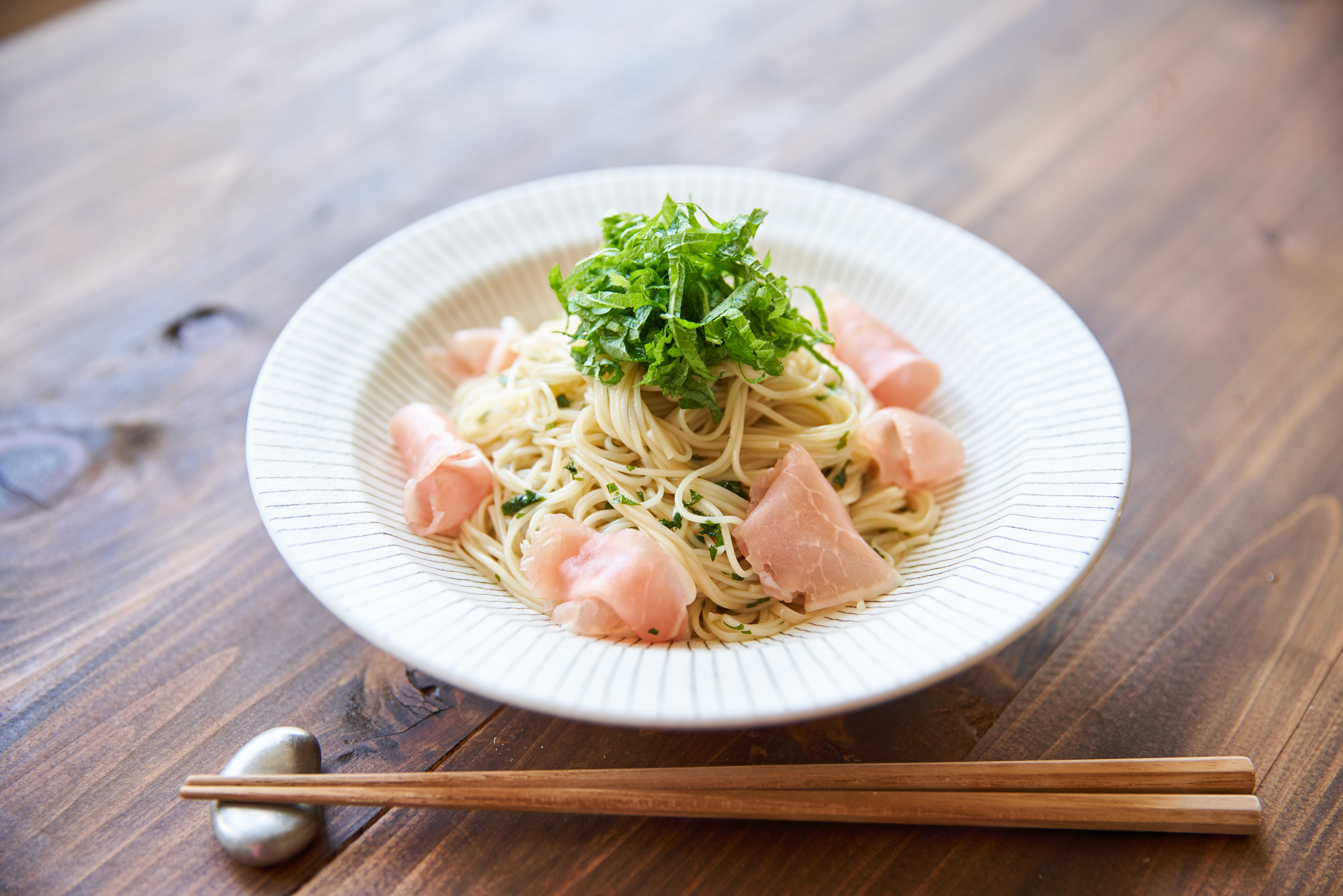 そうめんとソースを和えて器に盛り付け、手でちぎった生ハム、