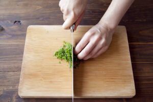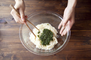 青じそは5枚をトッピング用に千切りに、残りを刻む。