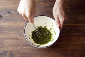 刻んだ青じそとオリーブオイル、薄口しょうゆ、にんにくをボウルに合わせてよく混ぜ、ソースにする。