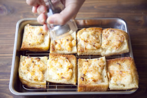 食パンは4等分に切り、ラップをかけ麺棒などで軽く潰す。 1をのせる。