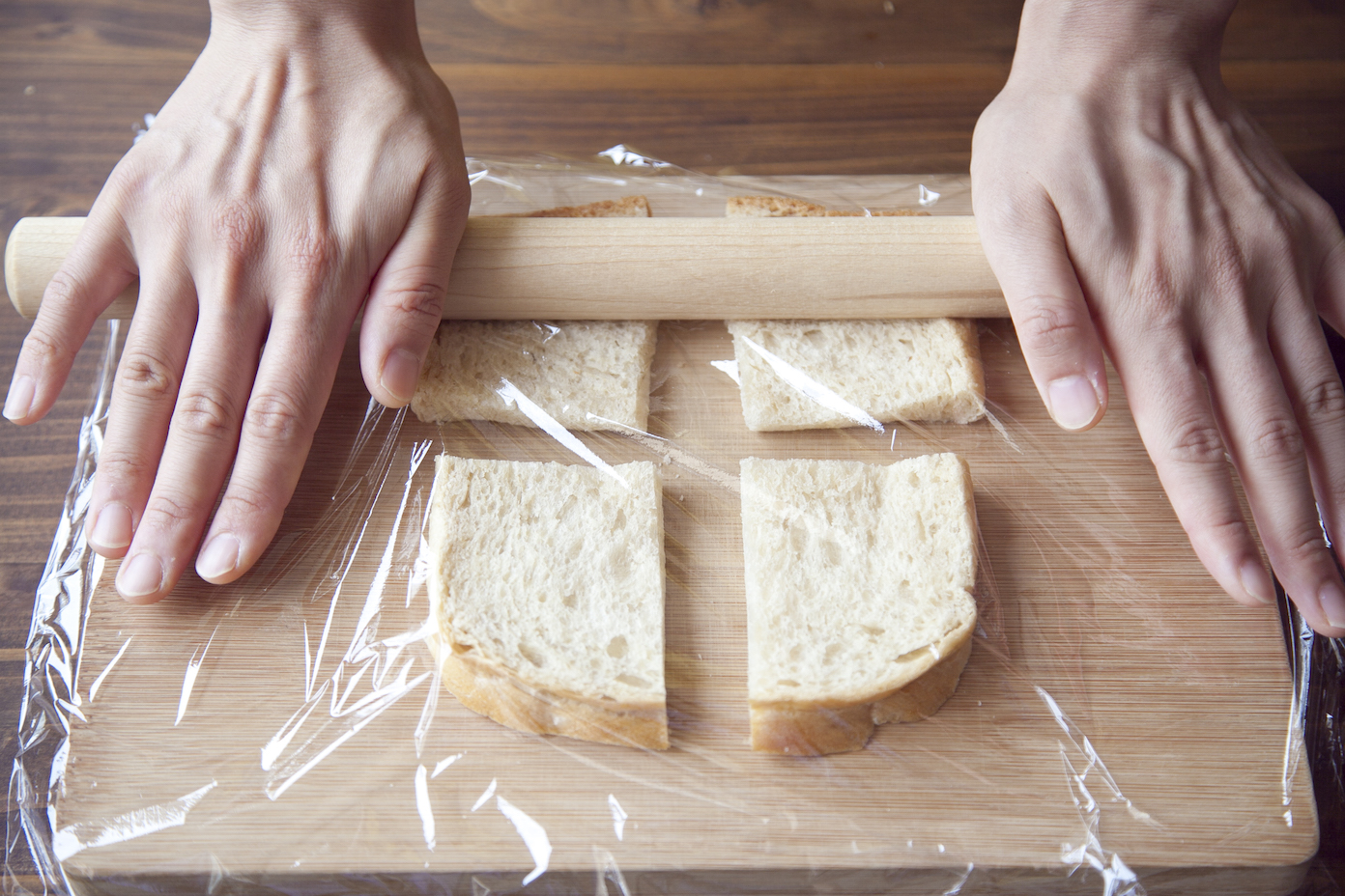 食パンは4等分に切り、ラップをかけ麺棒などで軽く潰す。 1をのせる。