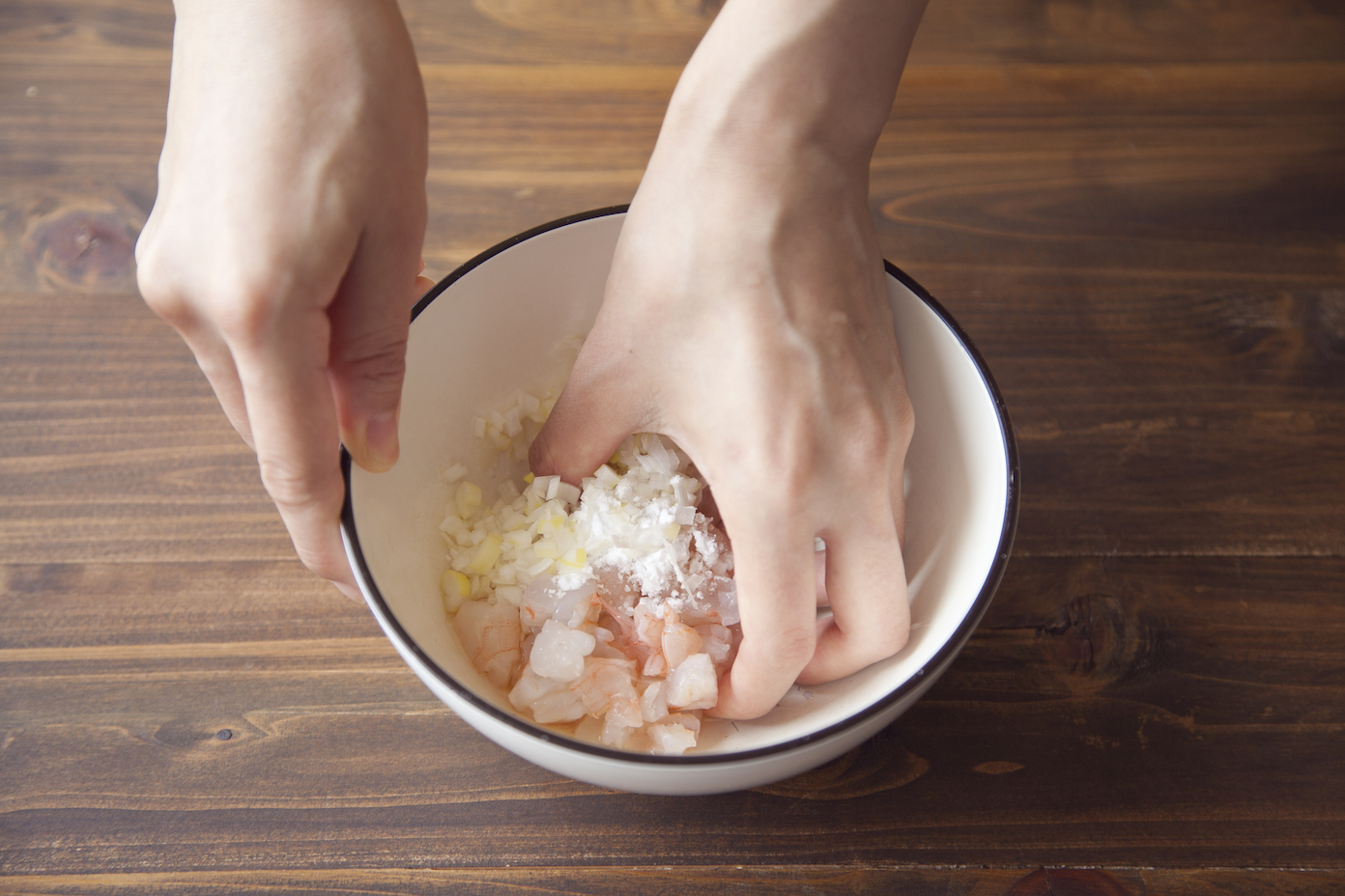 むき海老は洗って水気をふき、包丁で粗めにたたき、(A)と混ぜ る。
