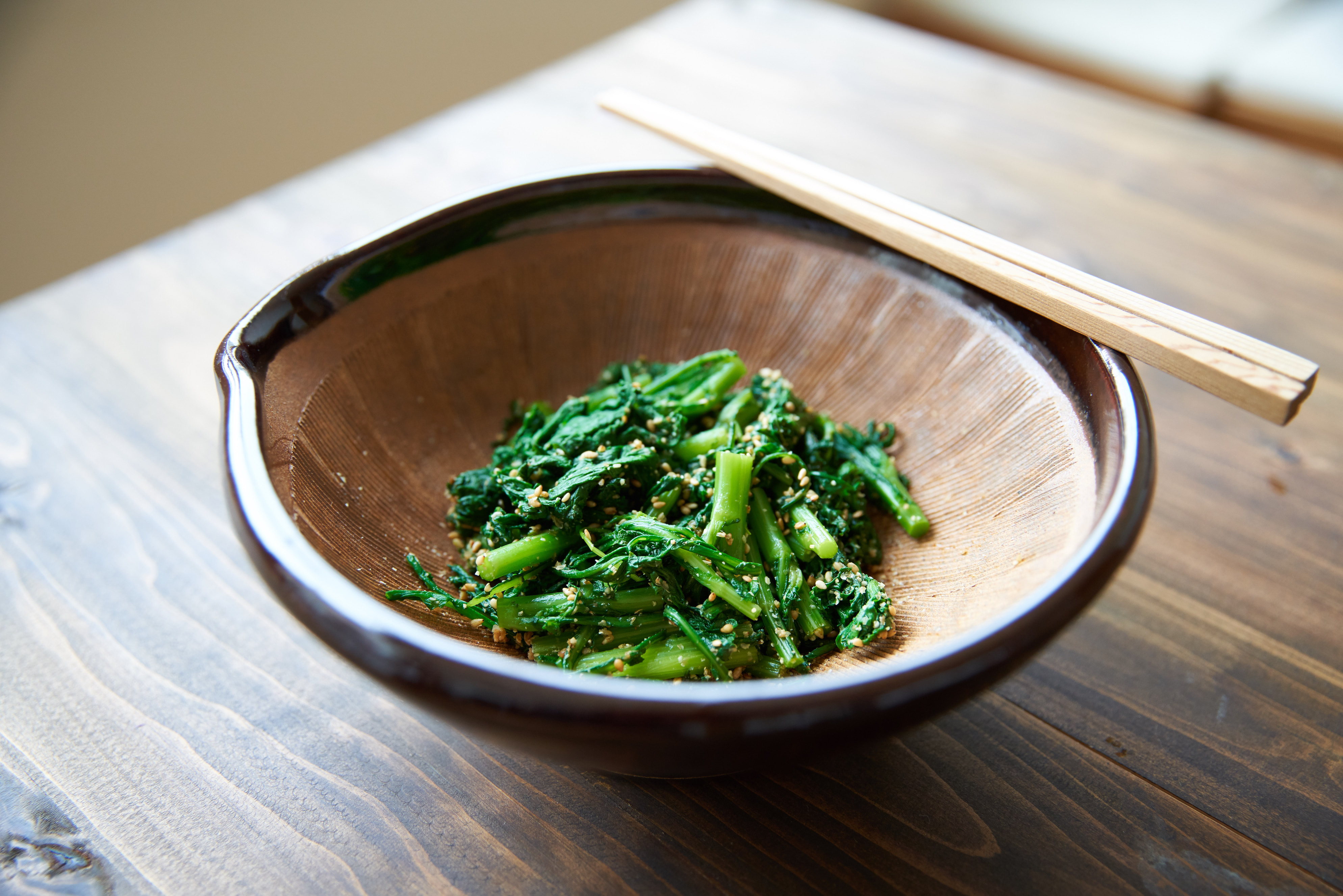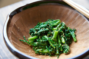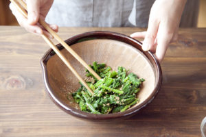 すり鉢に白いりごまを入れてすり、しょうゆ、砂糖を加えて、春菊を加えて和える。