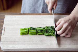 春菊を持ったまま茎から湯に入れ、茎がしんなりとしてきたら葉も入れて10秒ほど茹でる。