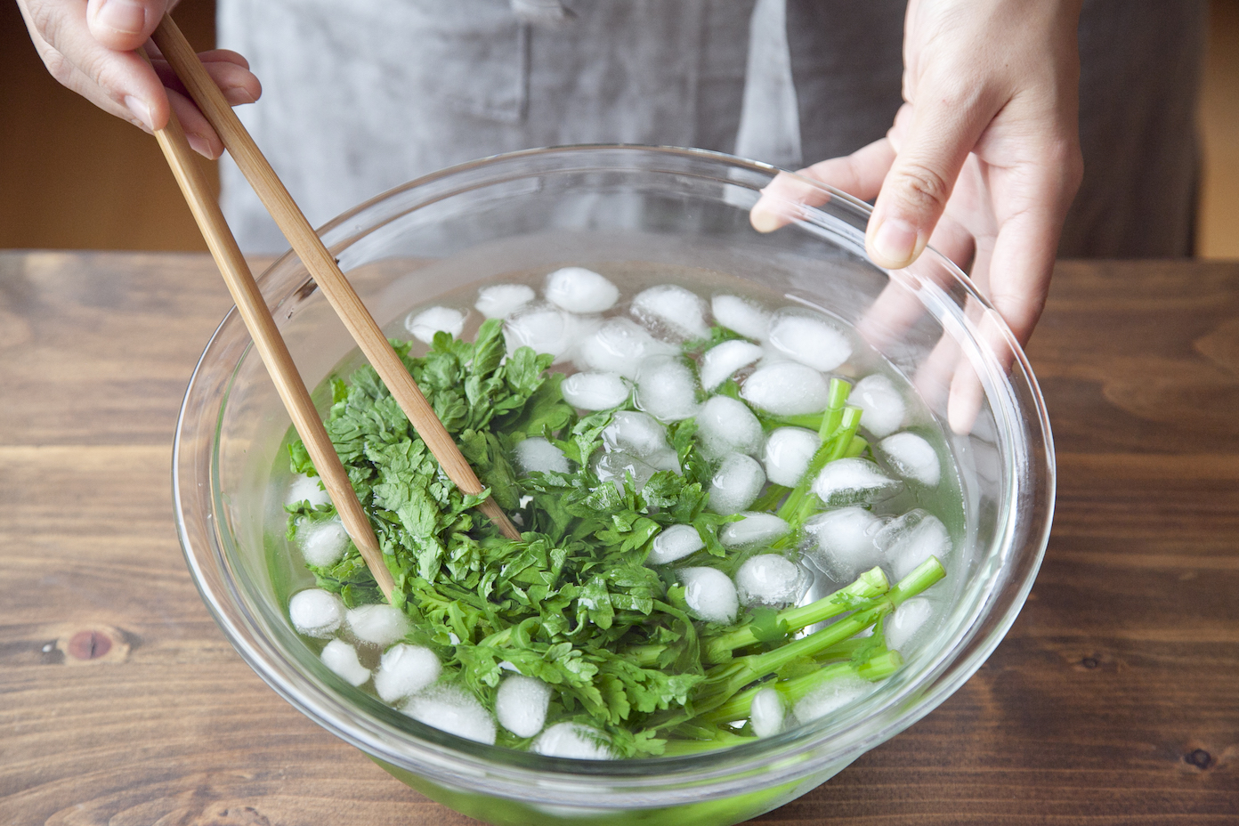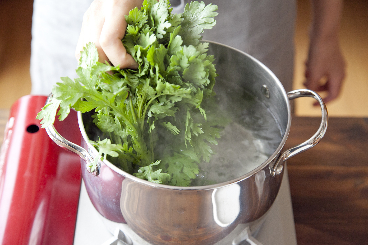 春菊を持ったまま茎から湯に入れ、茎がしんなりとしてきたら葉も入れて10秒ほど茹でる。