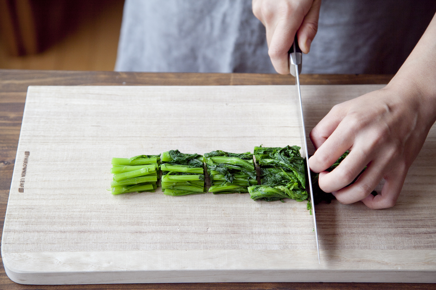春菊を冷水に入れ、冷めたら水気をしっかり絞り、4cm程度に切る。