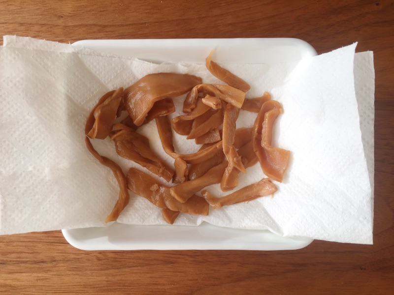 メンマの水気をキッチンペーパーでよく拭き取り、キッチンペーパーの上において冷蔵庫で30分以上乾燥させる。