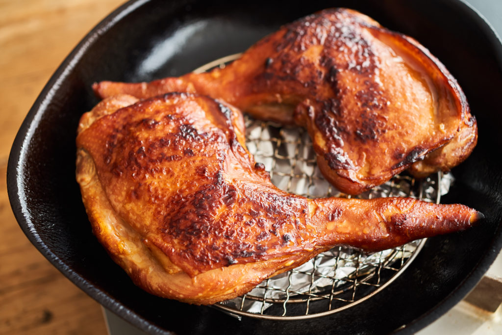 煙が出たら、中火にし、スモークチップの上にアルミホイル、網をのせ、その上に鶏肉を入れて蓋をして10分ほど加熱する。