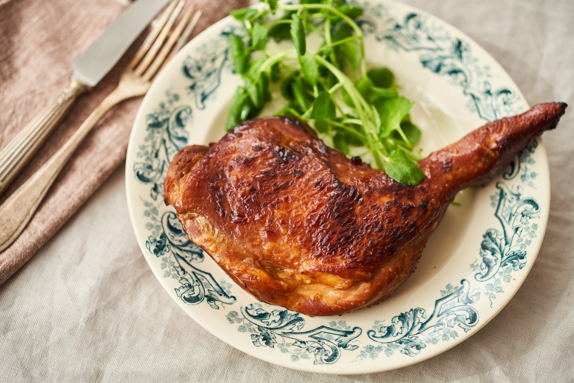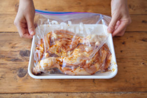 鶏肉は骨に沿って切り込みを入れ、皮目にフォークで数カ所穴をあけ、ジッパー付き保存袋に入れる。