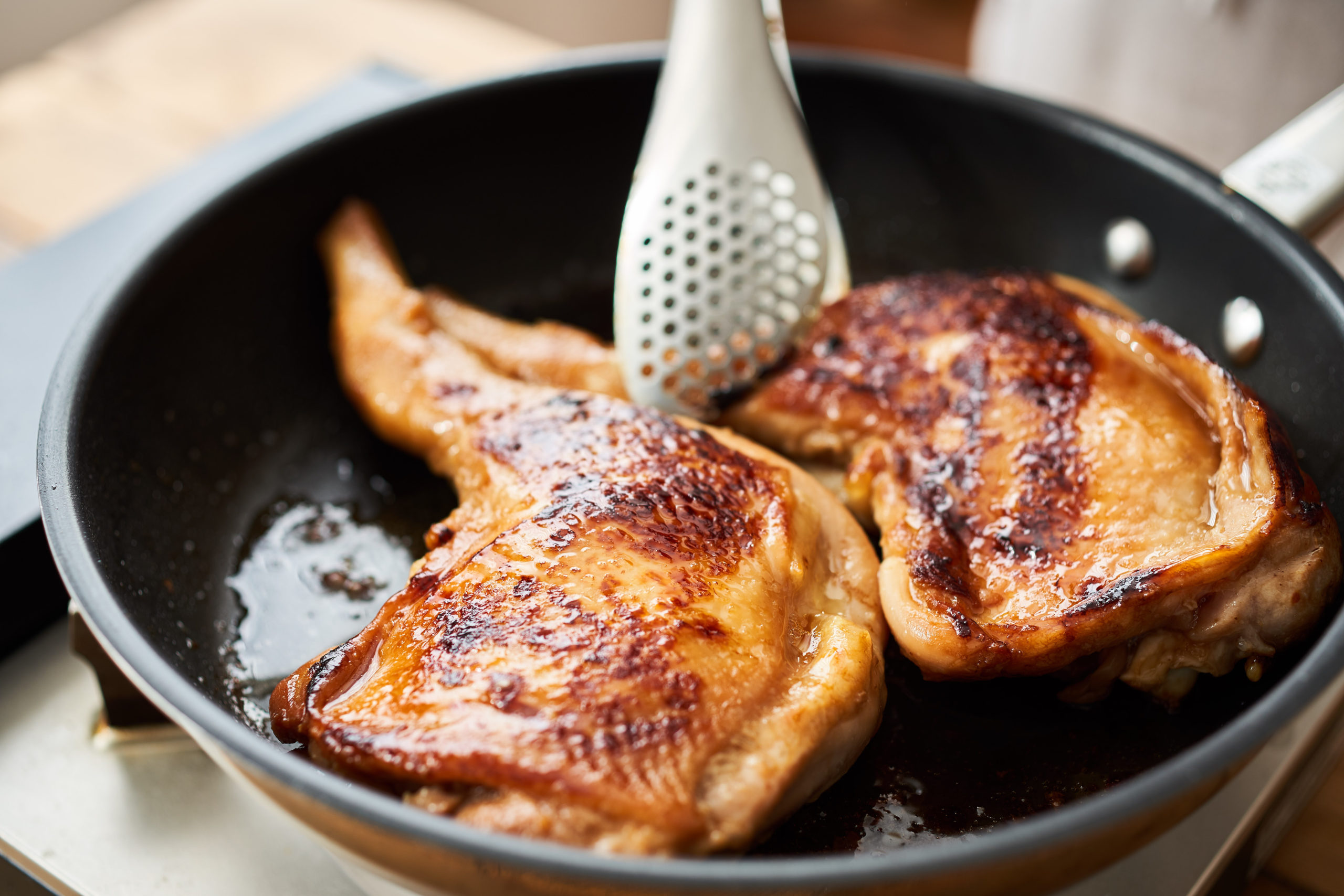 フライパンにオリーブオイルを中火で熱し、鶏肉の水気をペーパーで拭き取って皮目を下にして入れる。