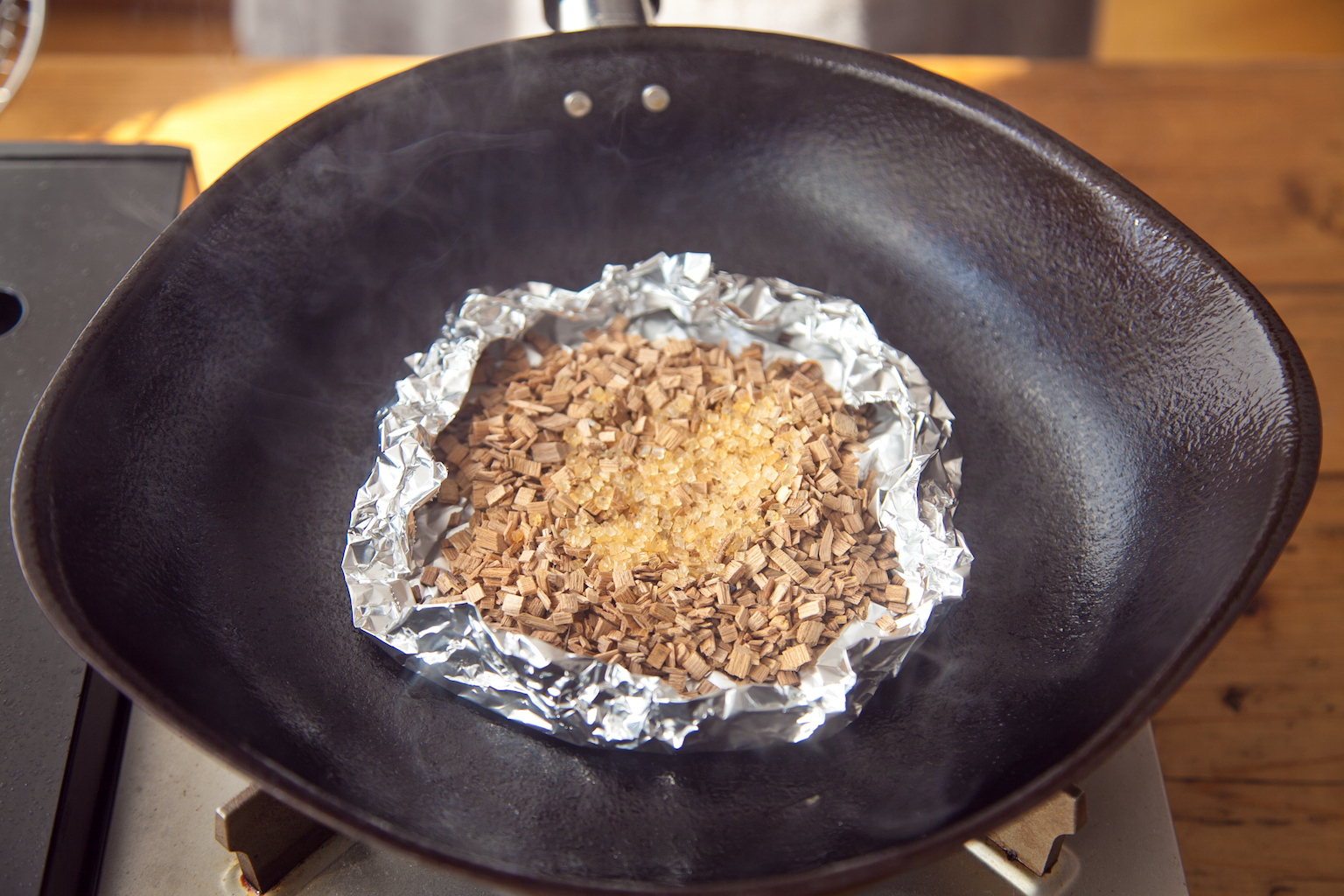 アルミホイルにのせたスモークチップ、ザラメ(あれば)をセットし、強火にかける。