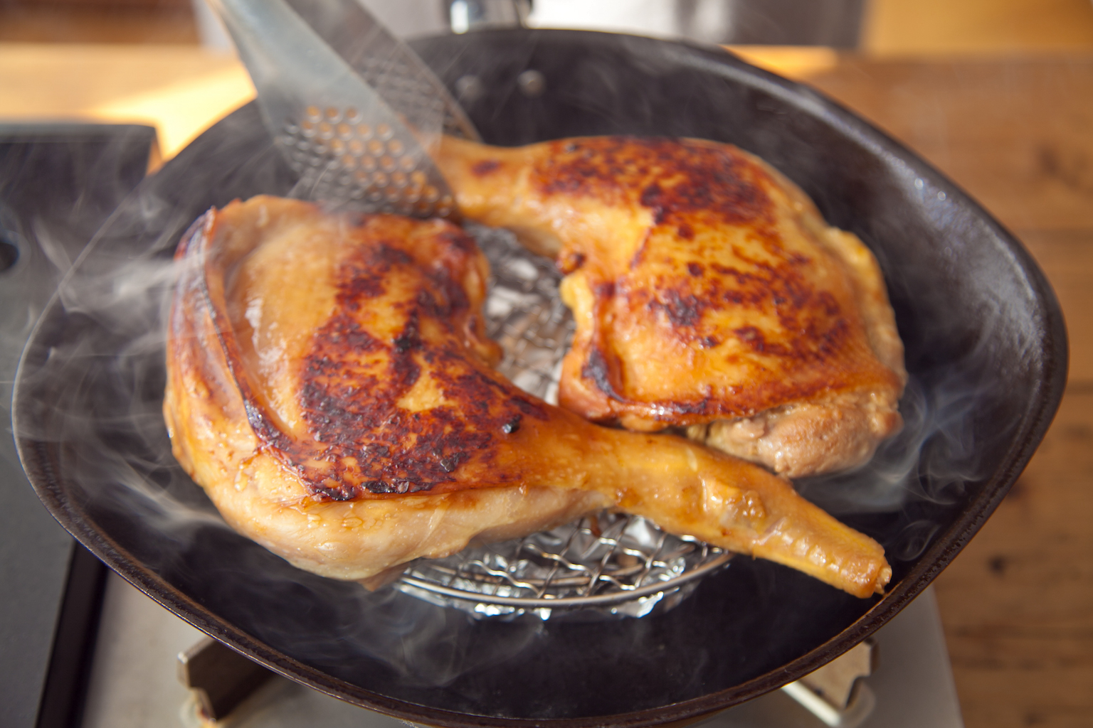 煙が出たら、中火にし、スモークチップの上にアルミホイル、網をのせ、その上に鶏肉を入れて蓋をして10分ほど加熱する。