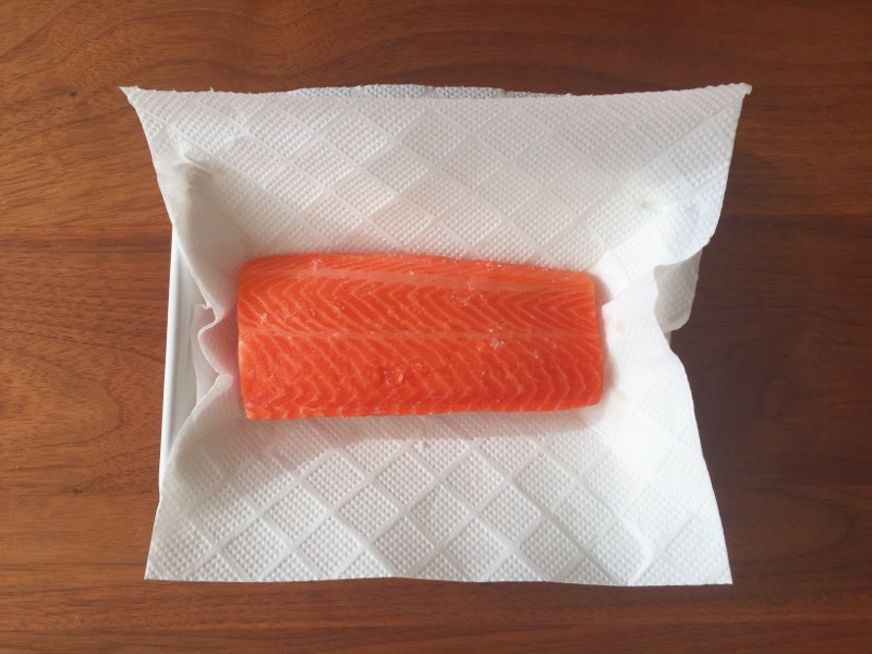 サーモンの水気をキッチンペーパーでよく拭き取り、塩をまんべんなく振り、キッチンペーパーの上において冷蔵庫で1時間以上乾燥させる。
