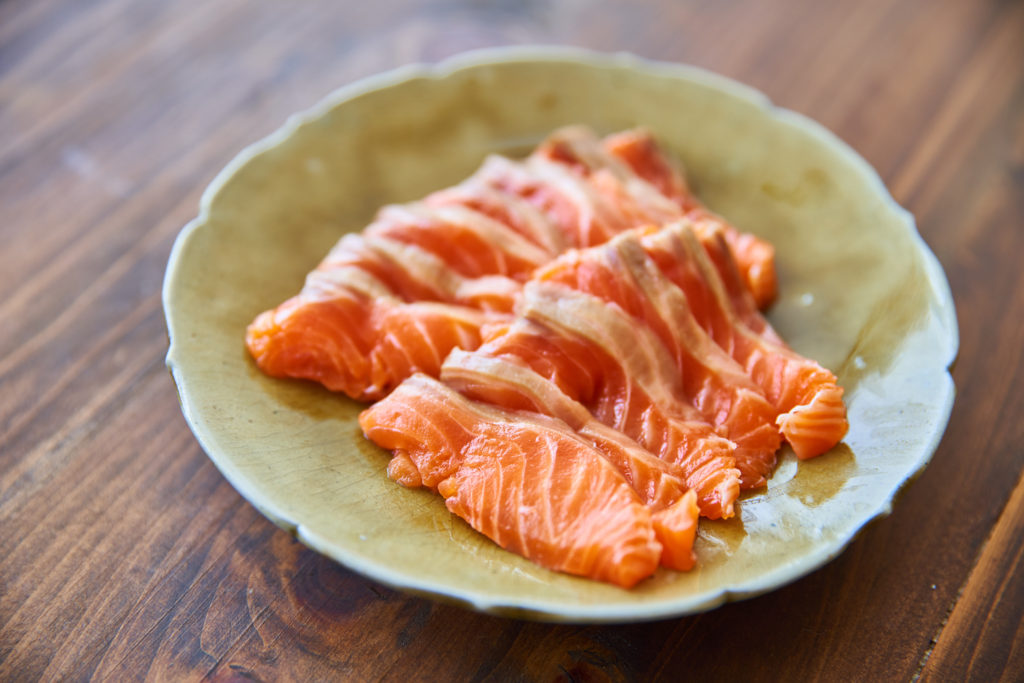 熱いので気をつけてボウルをとり、サーモンを薄切りにして盛り付ける。