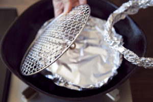 (※網の足が低い場合はアルミホイルを丸めて高さを出します。)