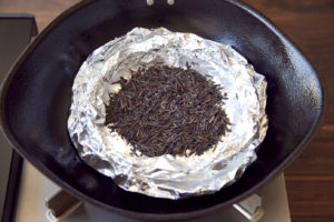 フライパンにアルミホイルを皿状にしていれ茶葉をいれる。