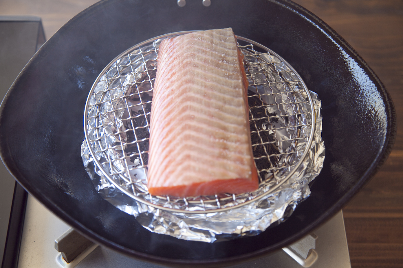 ほうじ茶の茶葉を使って、フライパンでできる手軽なスモークサーモンです。