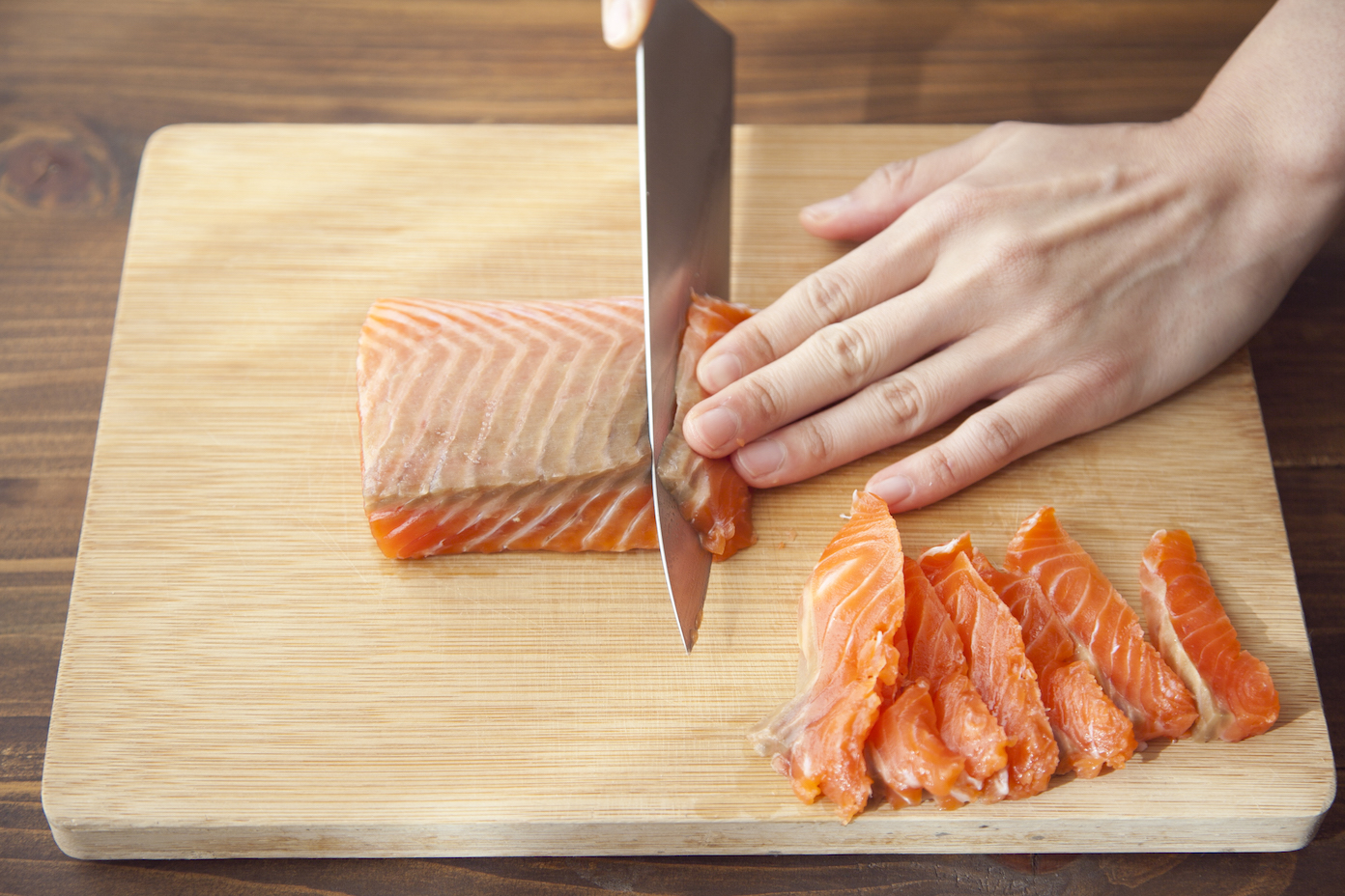 熱いので気をつけてボウルをとり、サーモンを薄切りにして盛り付ける。