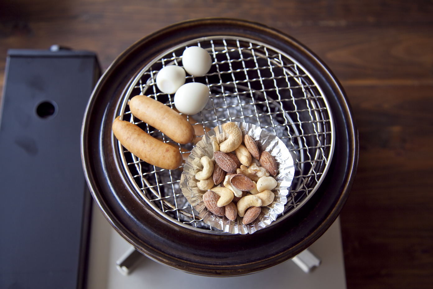 網にミックスナッツ、ウインナー、うずらの卵をのせ、強火にかける。