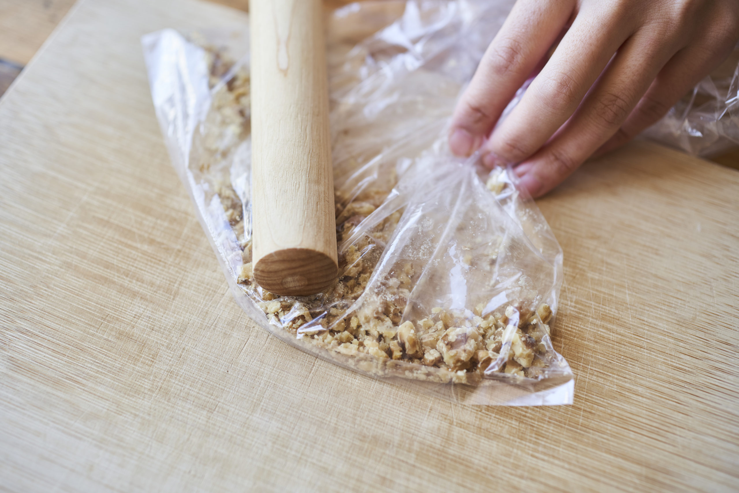 オーブンは160度に予熱する。くるみはポリ袋に入れてたたく。