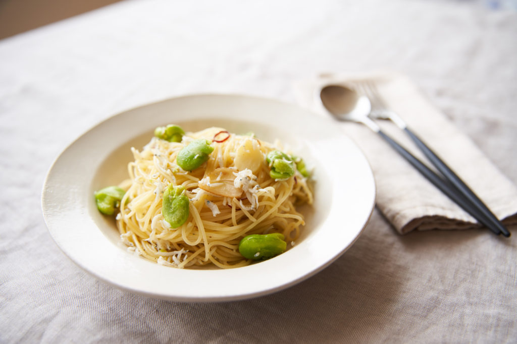 旬のそら豆としらすを使った春らしいペペロンチーノの作り方です。