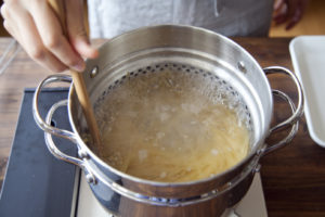 2と同じ鍋にスパゲッティを入れ、袋の表示より1分短く茹でる。