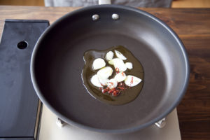 茹で上がりに合わせてフライパンにオリーブオイル、にんにく、赤唐辛子を中火で熱し、