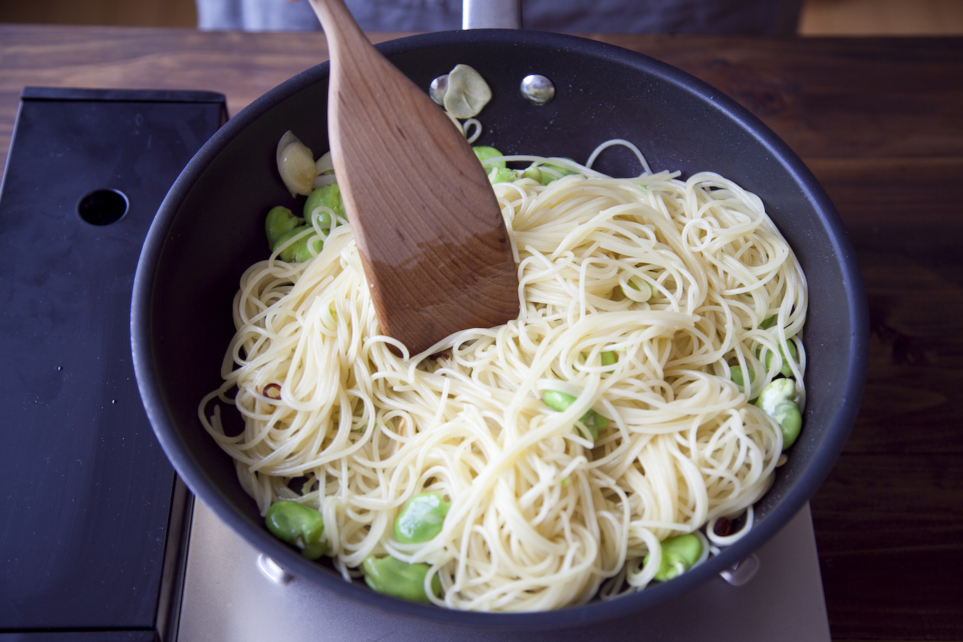 旬のそら豆としらすを使った春らしいペペロンチーノの作り方です。