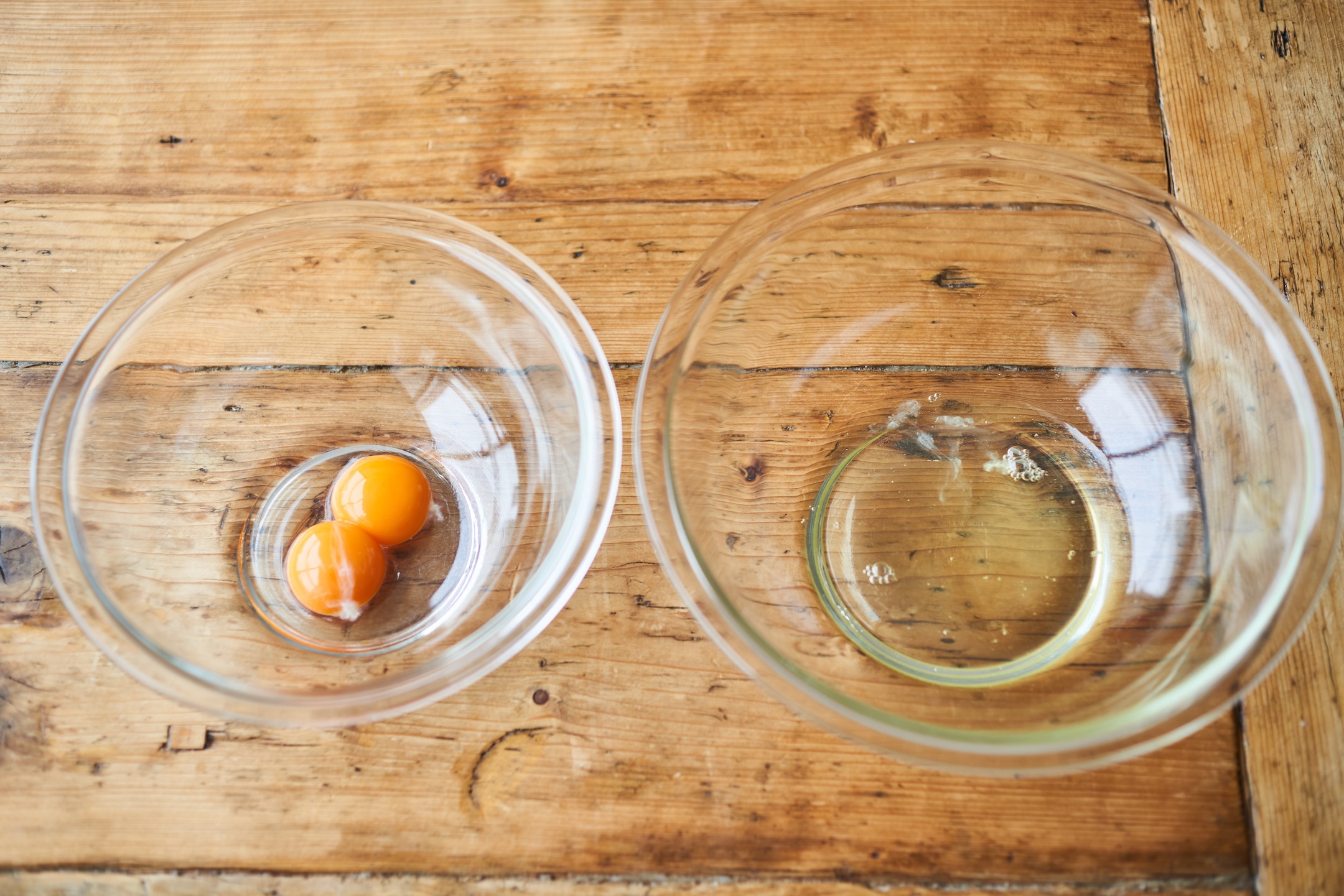 卵を卵黄、卵白に分ける。オーブンは 150 度に予熱する。