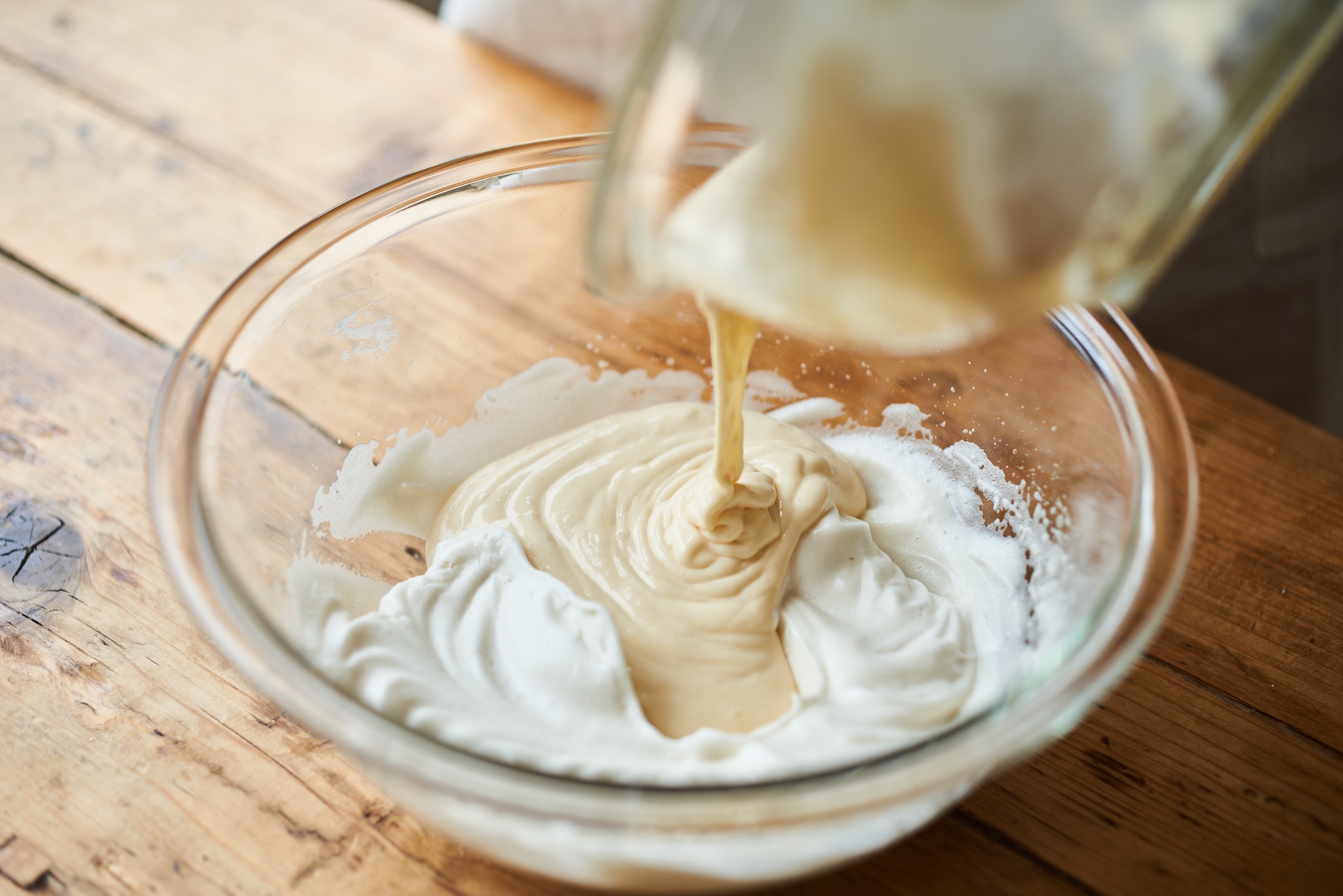 メレンゲのボウルに合わせて、ゴムベラで底からすくうようにさっくりと混ぜる。