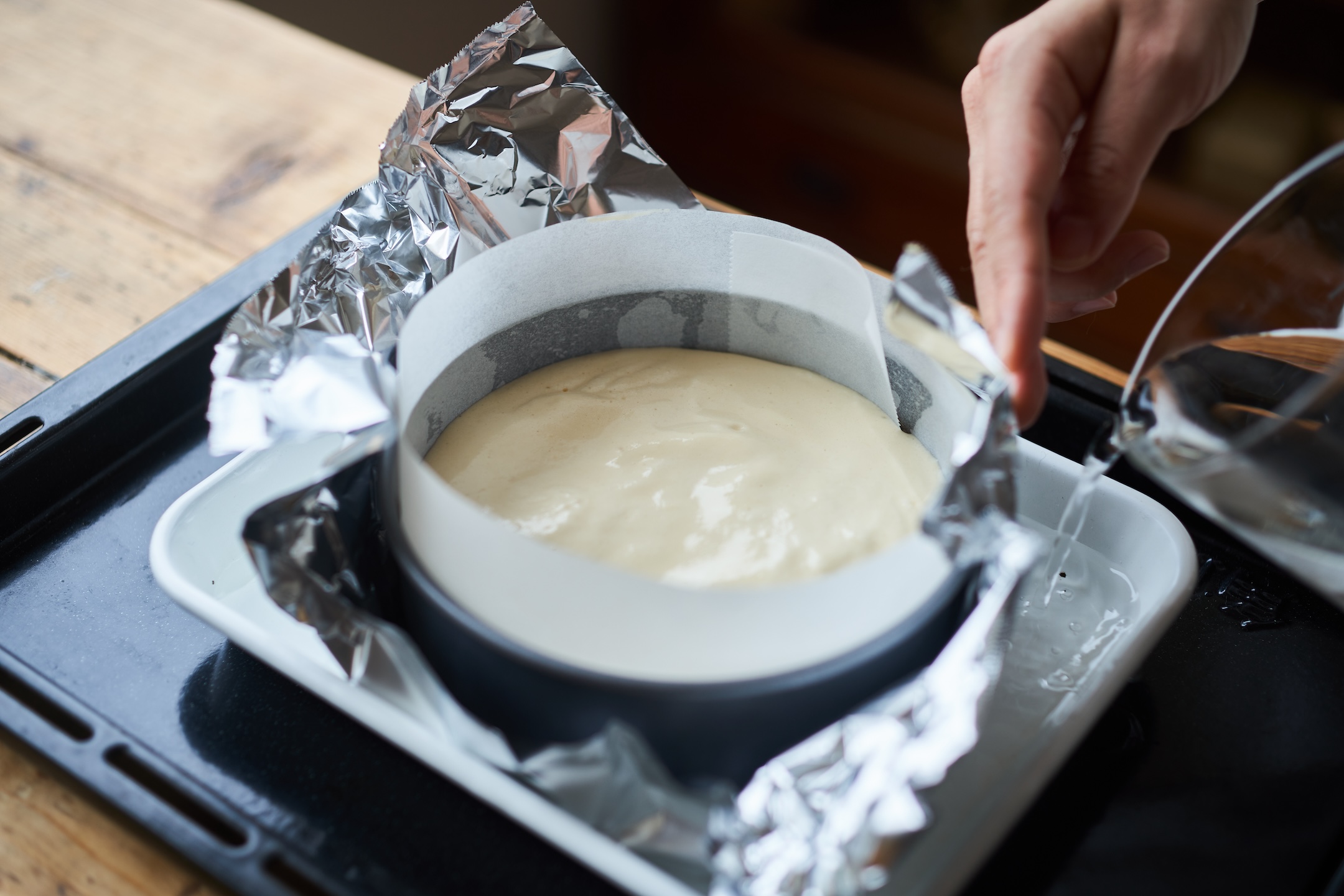 オーブンシートを敷いた型に4を注ぎ入れる。型の外側をアルミホイルで包んで、バットにのせ、
