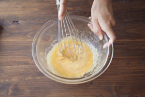 ボウルに卵、きび砂糖を入れて泡立て器ですり混ぜ、