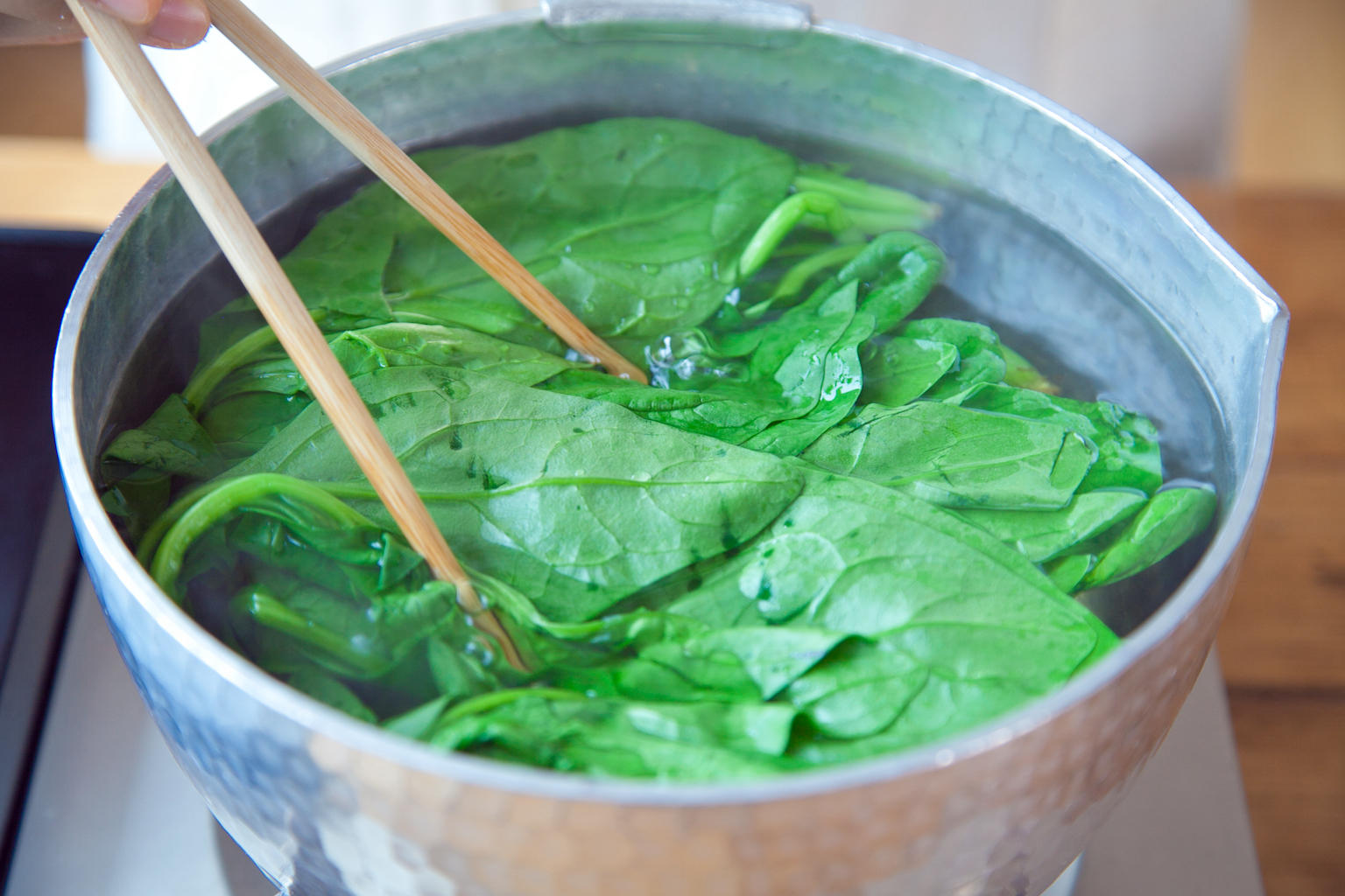 鍋にたっぷりの湯を沸かし、塩(少々/分量外)を入れて、ほうれん草をさっと茹でる。