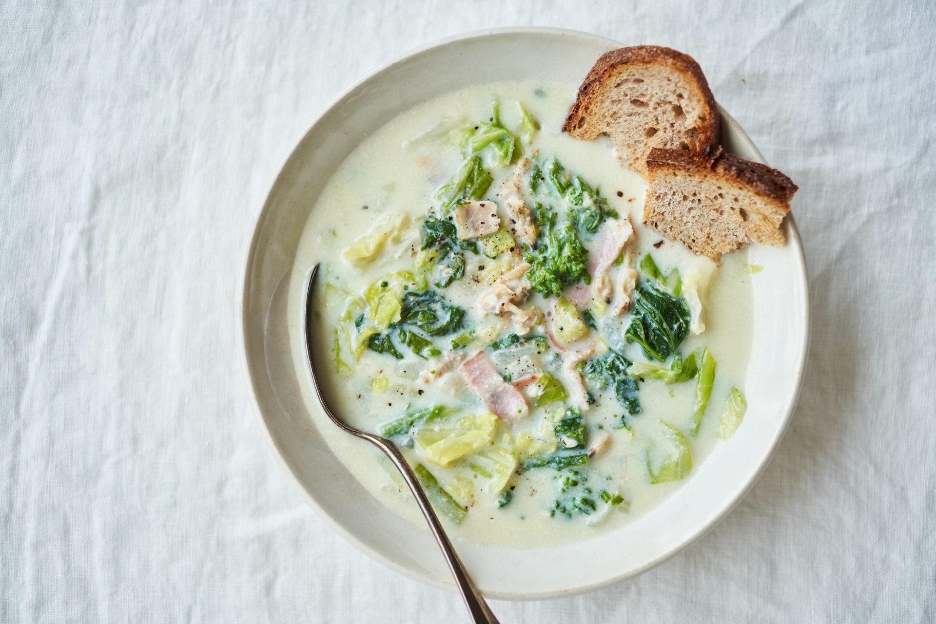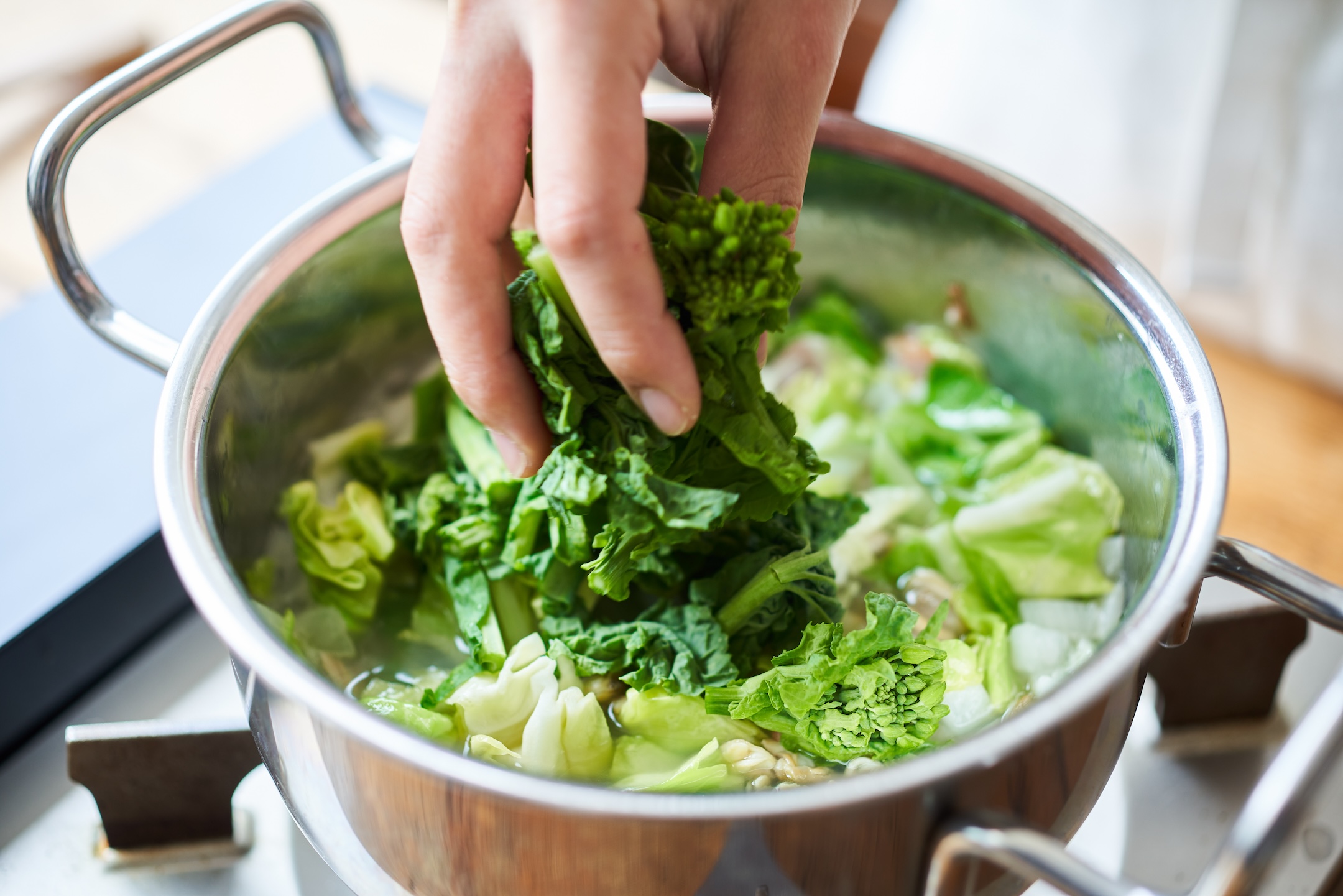 春キャベツ、新玉ねぎ、菜の花と春野菜たっぷりのスープ、